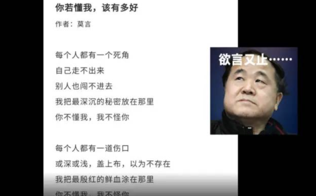 莫言透露,自己还曾因诗歌《你若懂我该有多好》被选入某大学教材,收到400元稿费,“我希望此诗的作者赶快把自己的'孩子'认领回去,同时也把稿费领回去。”