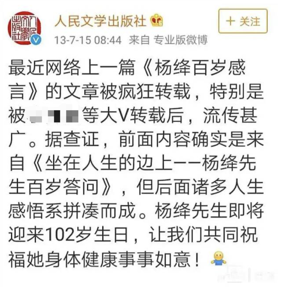 据潇湘晨报消息,2013年杨绛生日前后,“杨绛百岁感言”在网络上流行一时。杨绛作品版权所属的人民文学出版社在问询过杨绛本人之后,正式在官微辟谣↓