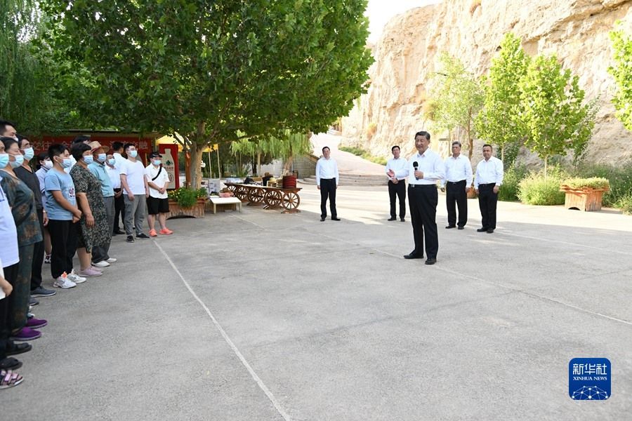 14日下午,40摄氏度高温下,习近平总书记沿着中央大道,进门阙,入城池。城垛、街巷、庙宇、市井、官署、作坊、民居,残垣断壁,耸立于蓝天黄土之间,历史的沧桑扑面而来。
