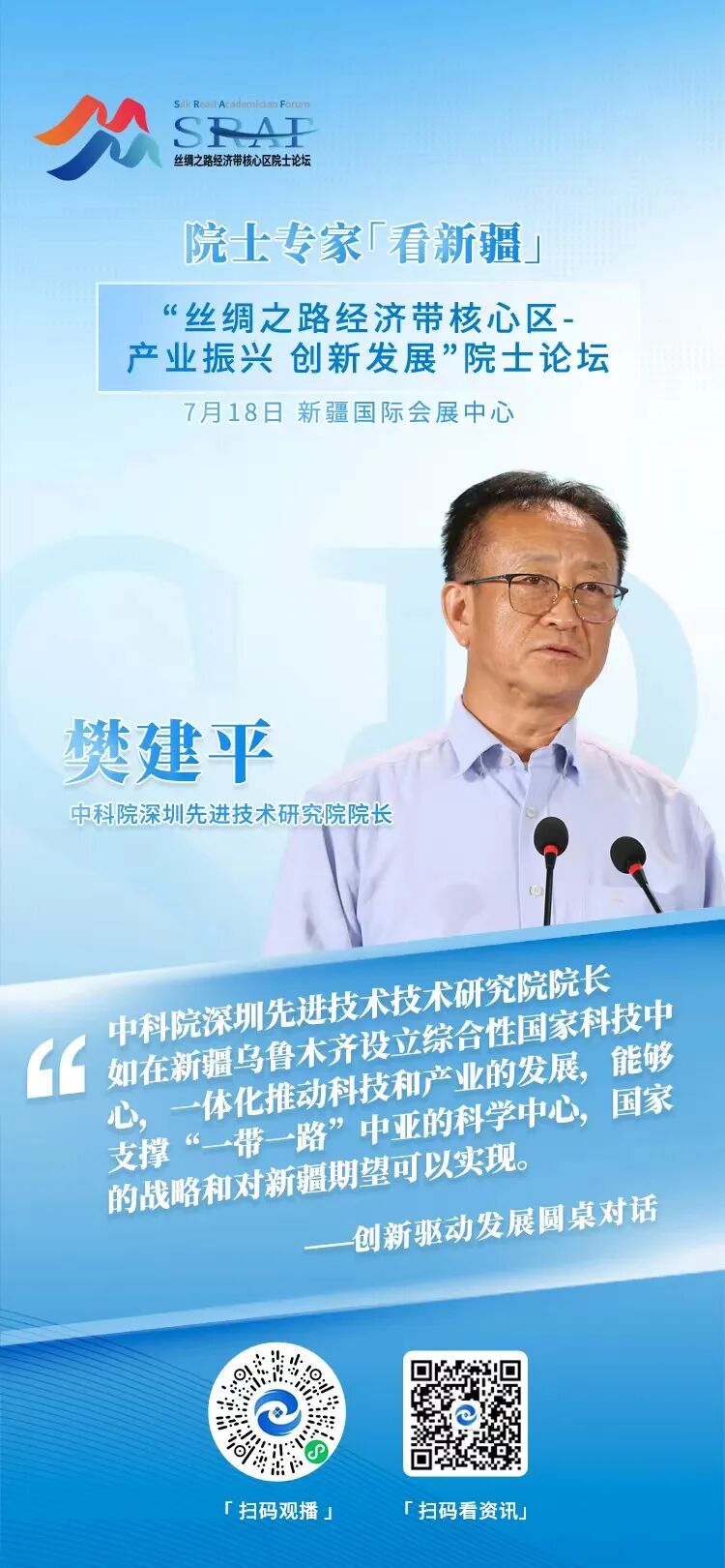 中科院深圳先进技术研究院院长樊建平介绍了中科院深圳先进技术研究院从16人到5000多人,实现产值的创新案例,希望深圳的经验对新疆发展有借鉴,还表示,新疆应该向以色列、新加坡学习,建设区域性的综合国家科学中心,一体化推动科技和产业的发展,融入“一带一路”建设蓝图,支撑国家西部和北部的发展。