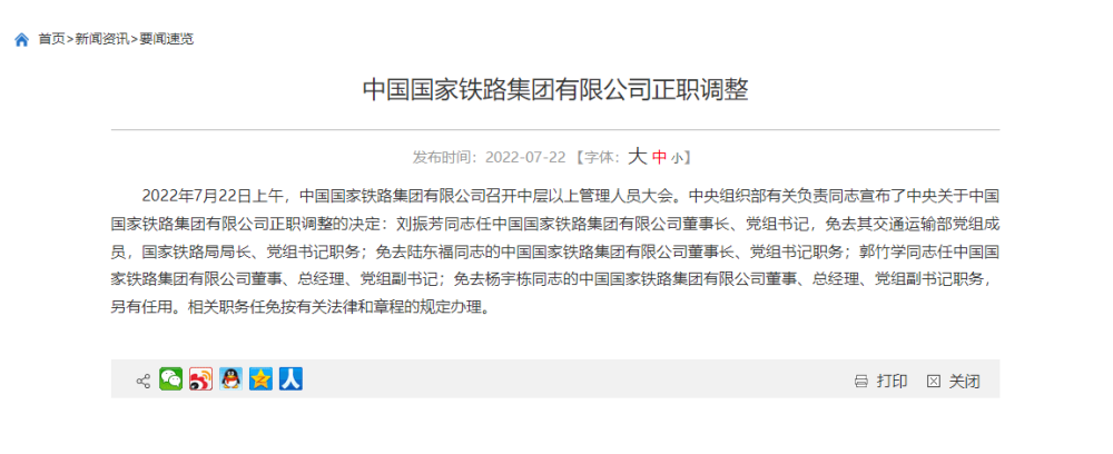 2022年7月22日上午,中国国家铁路集团有限公司召开中层以上管理人员大会。中央组织部有关负责同志宣布了中央关于中国国家铁路集团有限公司正职调整的决定:刘振芳同志任中国国家铁路集团有限公司董事长、党组书记,免去其交通运输部党组成员,国家铁路局局长、党组书记职务;免去陆东福同志的中国国家铁路集团有限公司董事长、党组书记职务;郭竹学同志任中国国家铁路集团有限公司董事、总经理、党组副书记;免去杨宇栋同志的中国国家铁路集团有限公司董事、总经理、党组副书记职务,另有任用。相关职务任免按有关法律和章程的规定办理。