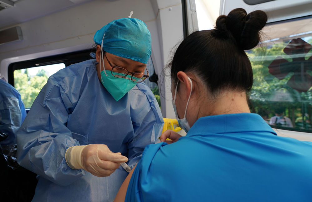 7月13日,在北京市海淀区北下关街道中国农业科学院社区新冠疫苗临时接种点,医护人员在流动疫苗接种车上为社区居民接种。新华社记者 任超 摄