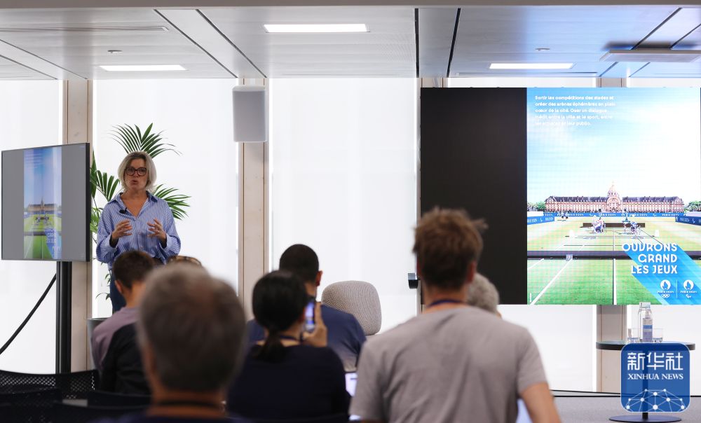 7月25日,带有2024年巴黎奥运会和残奥会口号的海报在发布会现场屏幕上展示。
