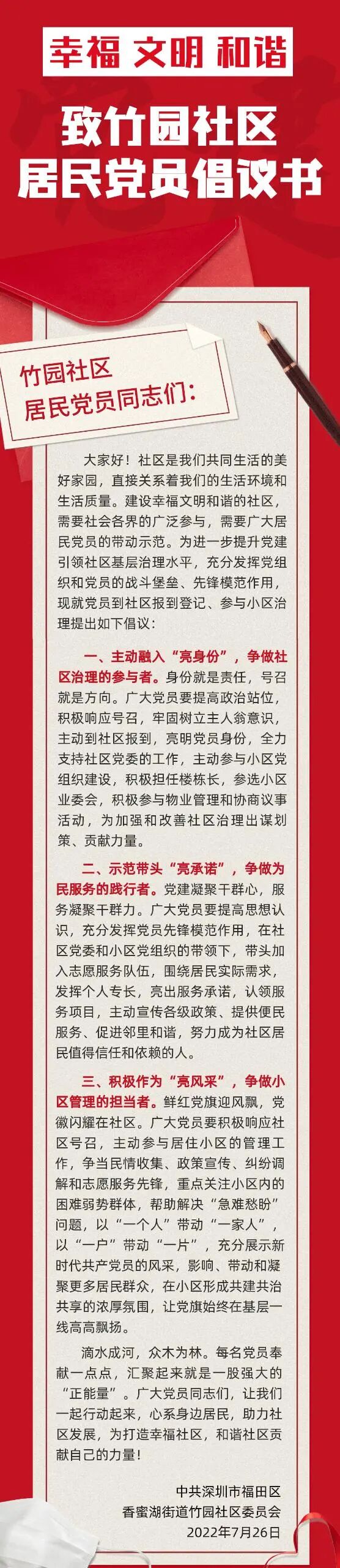 近日,香蜜湖街道党工委发出《致竹园社区居民党员倡议书》,在党员微信群广泛转发宣传,同时印制1000份纸质版的宣传单张,在开展活动时发放给党员,以此号召小区党员积极主动向居住社区小区报到,主动亮身份、亮承诺、亮风采,参与小区治理。