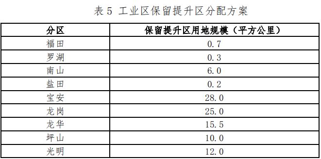 将保留提升 100 平方公里工业区,稳定基础制造空间,支持实体经济发展。将全市约 100 平方公里建设形态好、建筑质量高、占地规模较大的工业集中区域纳入保留提升区,予以长期锁定并提升能级,全面保障对深圳具有战略性、支撑性意义的实体产业空间需求,形成预期稳定、成本适中、集约高效的先进制造业集聚区。保留提升区内用地“十四五”期间原则上不得新增纳入拆除重建类更新单元计划和土地整备计划,鼓励运用综合整治、产业用地容积调整等措施提升工业区能级。
