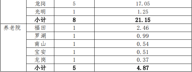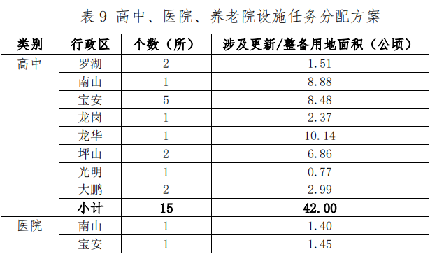 加快推进涉及医疗卫生设施和养老设施的城市更新和土地整备项目,扩大优质医疗卫生设施和养老设施供给,进一步促进医疗、养老资源的公平分配与设施的均衡布局。规划期内全市通过城市更新和土地整备保障不少于 8 所医院的新、改、扩建用地,涉及用地面积约 21 公顷,增加床位约1300 个;通过城市更新和土地整备保障不少于 5 所养老院的新、改、扩建用地,涉及用地面积约 5 公顷,增加床位约 2000个。