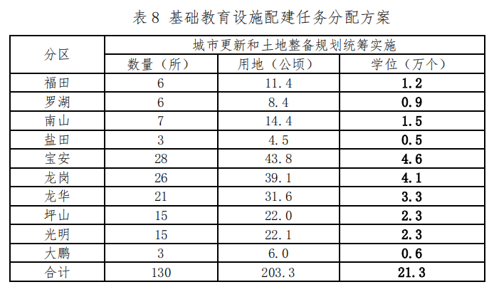 比如,加大城市更新和土地整备对基础教育设施的保障力度,规划期内通过城市更新和土地整备完成基础教育设施不少于 130 所,用地面积不低于 203 公顷,预计新增规划学位不少于 21.3 万个。