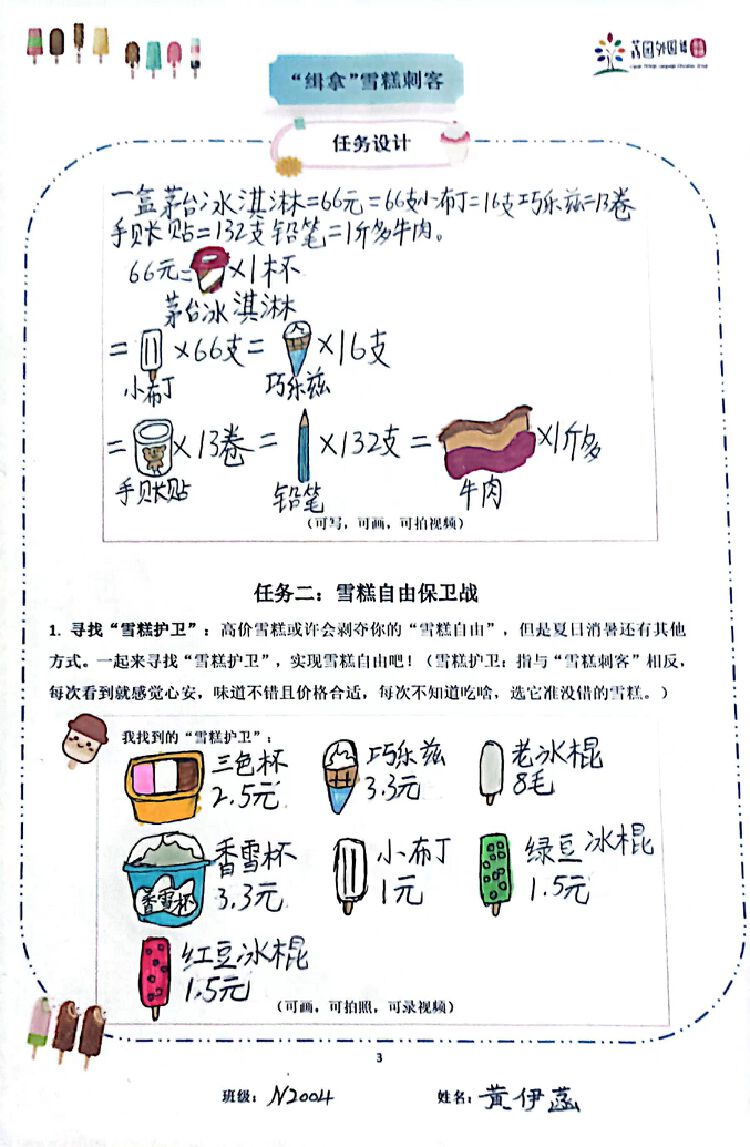 这份名叫《缉拿“雪糕刺客”》的项目式学习任务单整合了数学、科学、语文等各科知识:学生化身小记者,通过市场调研实地了解雪糕的成本及市场价格;再通过换算,比对“雪糕刺客”的价值与其他生活用品的价值;尝试亲手制作雪糕,实现“雪糕自由”……一项项活动,让学习过程变得趣味盎然。有的小朋友发挥创意,制作了多种口味的雪糕,收获了快乐和自信;有的小朋友在制作过程中积极思考,发现雪糕制作完成后体积会变大的现象,在迷茫中不断探究,让被动学习变成主动学习。