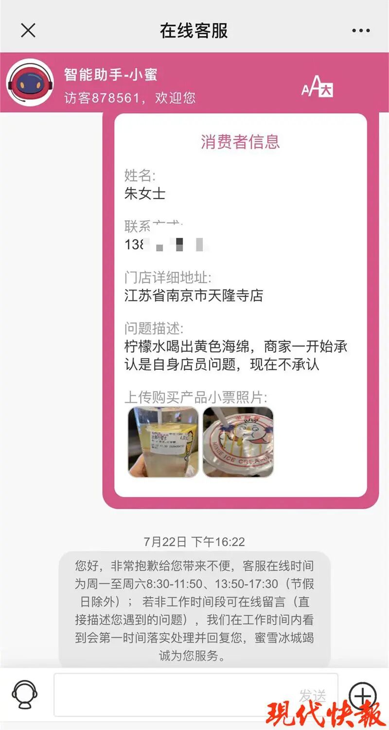 两杯蜜雪冰城的柠檬水,结果在其中一杯喝出一小块海绵。双方协商未果后,朱女士拨打12315投诉,并向现代快报反映此事。8月1日,记者对此展开调查。