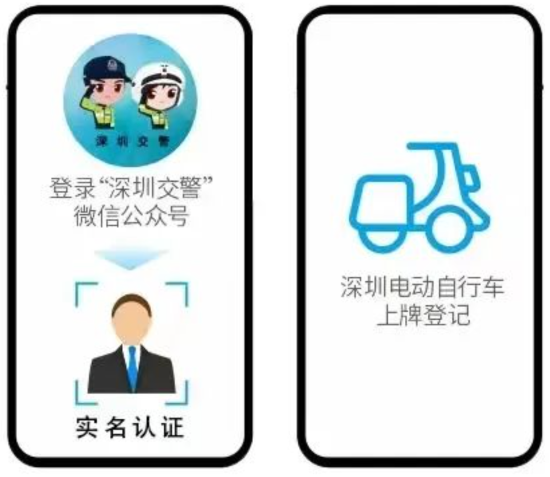 据介绍,市民可登录“深圳交警”微信公众号,进入“星级用户”,实名认证通过后选择“电动自行车号牌申请”。按提示对车辆拍照、预录入并拍照上传资料信息,等待系统后台预审。预审通过,按提示预约业务代办点交验车辆;预审未通过,微信将推送服务通知,告知车主未通过原因。按预约时间到业务代办点交验车辆。查验合格的,缴纳牌证制作费用,通过“五选一”方式线上确定号牌号码。