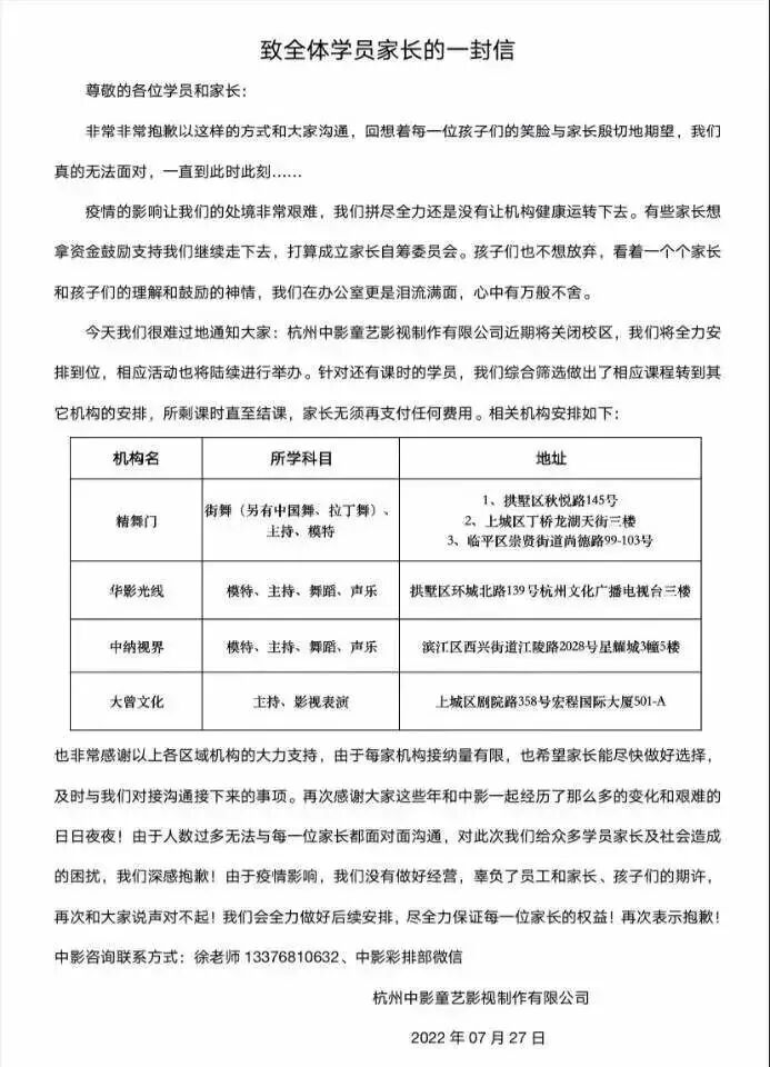 随后,中影童艺相关负责人徐先生对此进行了回应。据报道,徐先生解释了公司看起来“人去楼空”的情况,“因为欠了房租,物业要求我们搬走。”剩余工作人员均在线对接学员的转课事宜,因此校区处于无人状态,“我们没有跑路。”