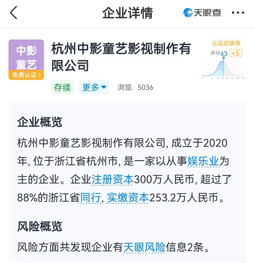 据天眼查信息显示,杭州中影童艺影视制作有限公司,成立于2020年8月20日,位于浙江省杭州市,是一家以从事娱乐业为主的企业。企业注册资本300万人民币,实缴资本253.2万人民币。此外,2020年12月29日成立的杭州中影童艺影视制作有限公司滨江分公司已于今年4月11日被注销。