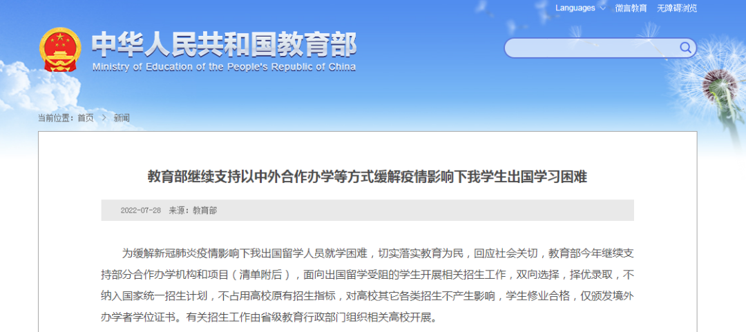 2022年秋季学期来临之际,全球新冠肺炎疫情形势依然严峻,出入境和人员往来受限,不少学生面临求学困境。为切实回应社会关切,教育部今年继续支持部分合作办学机构和项目,面向出国留学受阻的学生开展相关招生工作,缓解疫情影响下学生无法出国学习的困难。