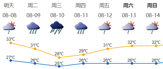 明天(8日)多云,有短时阵雨或雷雨,体感闷热。