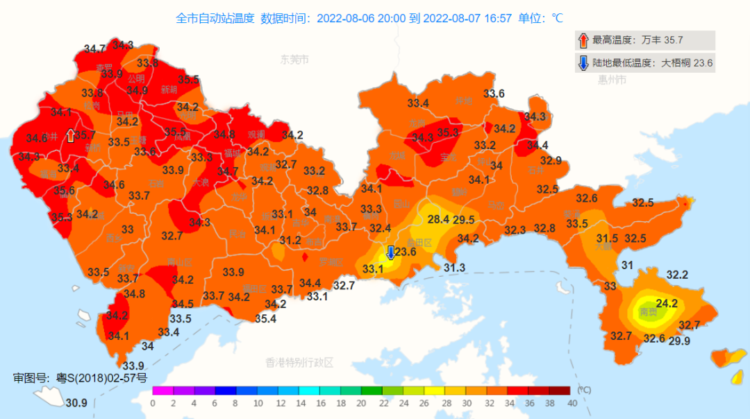 今天深圳市日最高气温普遍在33℃左右,中北部及人口密集区域甚至在34-35℃。