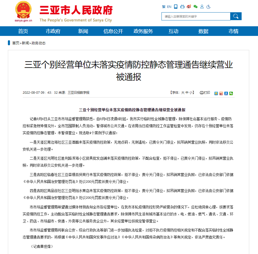 (原标题《三亚个别经营单位未落实疫情防控静态管理通告继续营业被通报》)