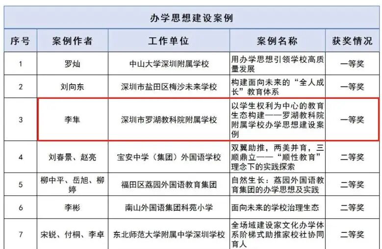 日前,深圳市教育科学研究院组织的深圳市未来教育优秀案例征集评选结果出炉。其中罗湖教科院附属学校的案例《以学生权利为中心的教育生态构建——罗湖教科院附属学校办学思想建设案例》荣获一等奖。