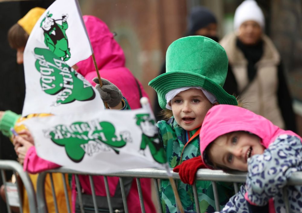 3月13日,两名儿童在英国伦敦观看圣帕特里克节游行。新华社记者李颖摄