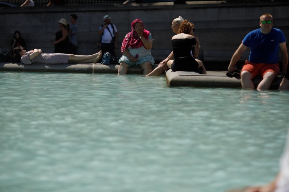 7月19日,人们在英国伦敦特拉法尔加广场喷泉旁纳凉。新华社发(蒂姆·爱尔兰摄)