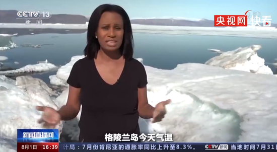 画面中,国外记者(CNN)虽站在格陵兰岛、背靠冰雪,但却身着一件单薄的T恤,并且还表示:像今天这样的天气,已经暖和到可以穿短袖了。