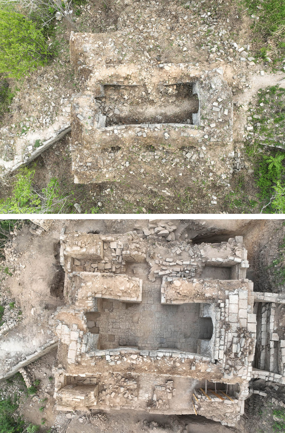 拼版照片:上图是考古前的大庄科段长城延庆4号敌台;下图是考古后的大庄科段长城延庆4号敌台。新华社发(北京市文物局供图)