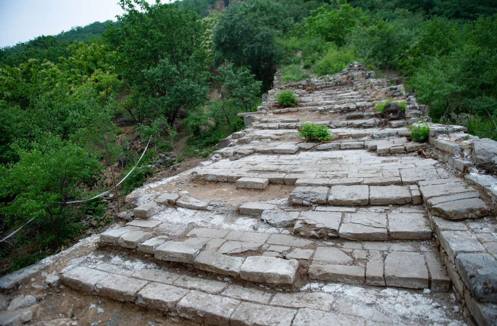 6月9日拍摄的大庄科段长城研究性修缮项目的一段长有植被的考古点位。前期考古工作明确了植被对长城建筑的影响。新华社记者陈钟昊摄