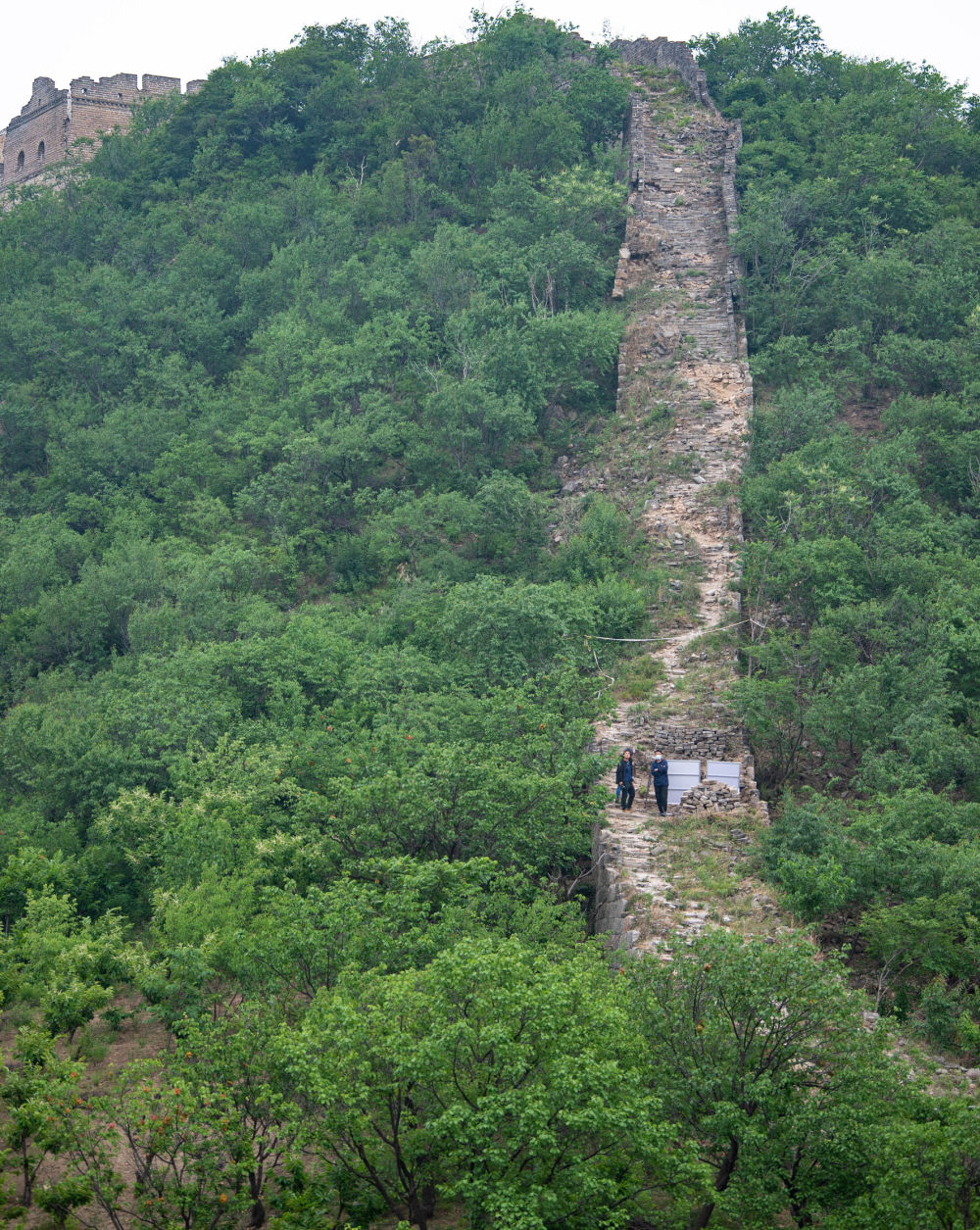 6月9日拍摄的大庄科段长城延庆2号敌台与3号敌台间的一段墙体。工作人员所站的位置是研究性修缮项目的一处考古点。新华社记者陈钟昊摄