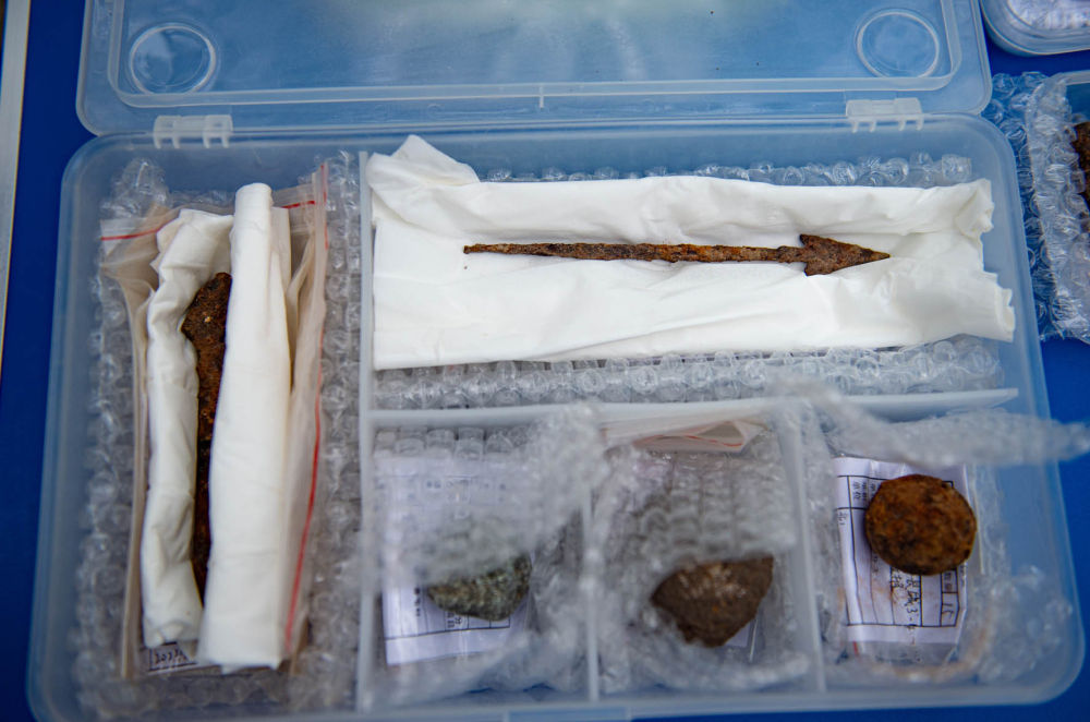 6月9日拍摄的大庄科段长城研究性修缮项目出土的文物,包含箭头、火炮弹等。新华社记者陈钟昊摄