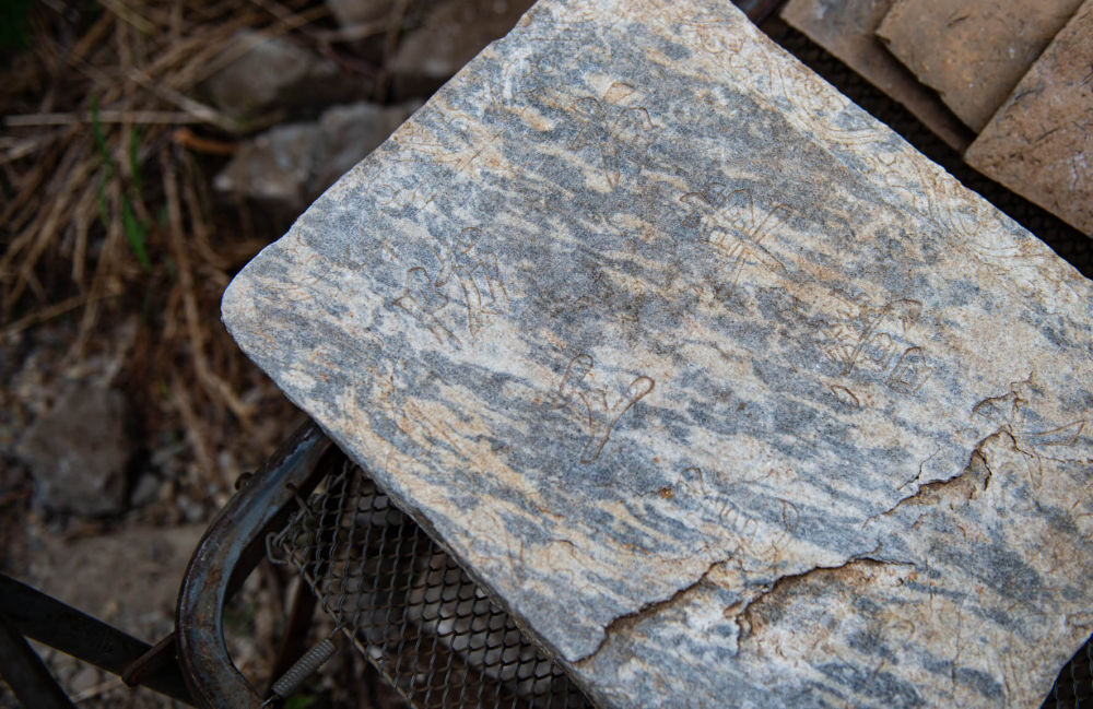 6月9日拍摄的大庄科段长城研究性修缮项目出土的施工分界碑。上面写着“右车营秋防工尾止”。新华社记者陈钟昊摄