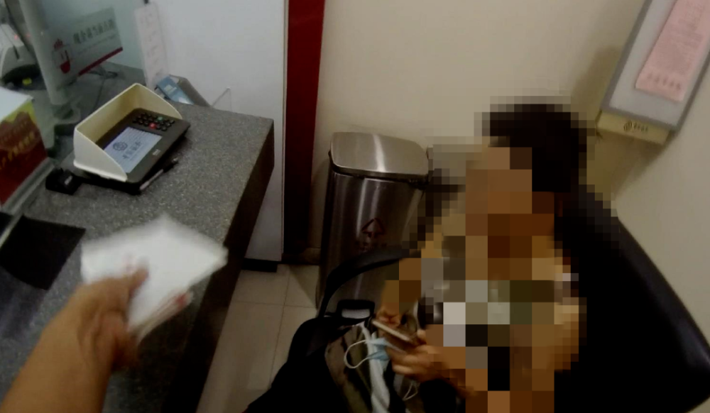 魏何锋在银行劝说王女士(执法记录仪截图)