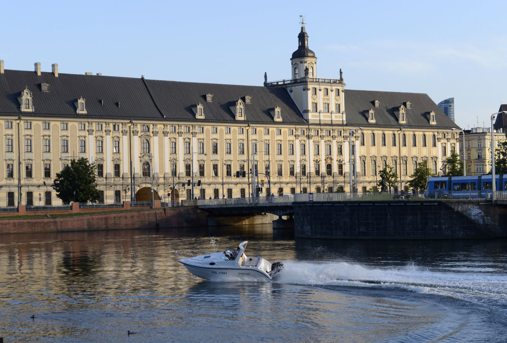 2012年6月,游艇从波兰弗罗茨瓦夫大学前的奥得河水面上驶过。(新华社记者武巍摄)