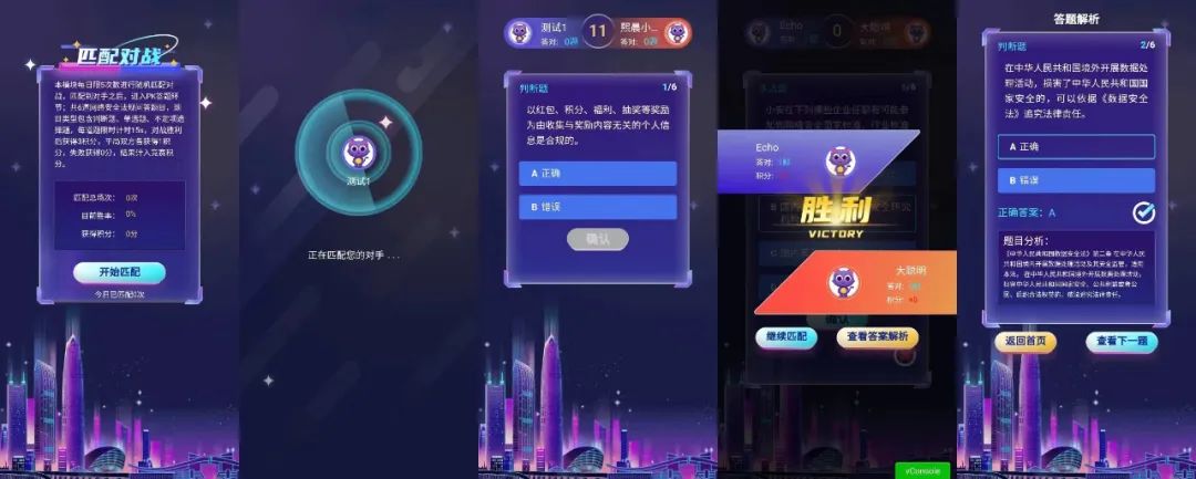 点击“匹配对战”,小安将在众多在线的参赛者中,为你安排实力相当的对战选手。8月13日至8月21日期间,每日有5次机会进行“battle”。你们将在快节奏的答题中逐出胜负,对战胜利后积3分,平局双方各获得1分,失败得0分,结果计入竞赛积分。在对战结果揭示页面,会有“查看答案解析”的选项,小安将会为你一一解答疑惑,以便下次更快更准击溃对方。