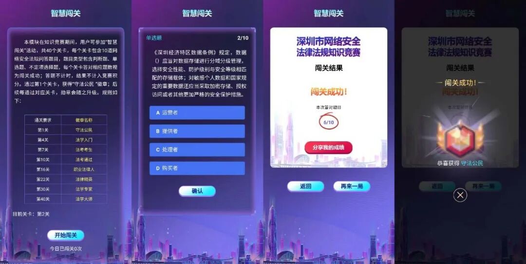 “智慧闯关”是属于勇者的“逐鹿场”,小安设置了40个关卡等你来闯。每个关卡包含10道网络安全法规问答题目,每个关卡答对相应题数视为闯关成功,答题不计时,结果不计入竞赛积分。通过第1个关卡,即可获得“守法公民”徽章,后续每通过对应关卡,勋章会随之升级。