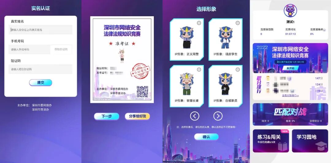 首先,你需要在实名认证环节中输入真实信息,以便获奖后小安可以找到你,为你送上精美奖品。认证完成后就会获得一张通往知识竞赛的准考证啦。接下来是形象选择,这里可以看到不同风格的小安,快选择你喜欢的小安并肩作战吧。进入首页,上方会展示你的竞赛答题数、竞赛时长、竞赛准确率和竞赛积分等,在积分排行榜中可以了解到目前自己的排名。本次竞赛共开放四大板块,“竞赛答题”、“匹配对战”、“练习&闯关”和“学习园地”每个板块玩法不同,各有特色,给予不一样的学法体验。