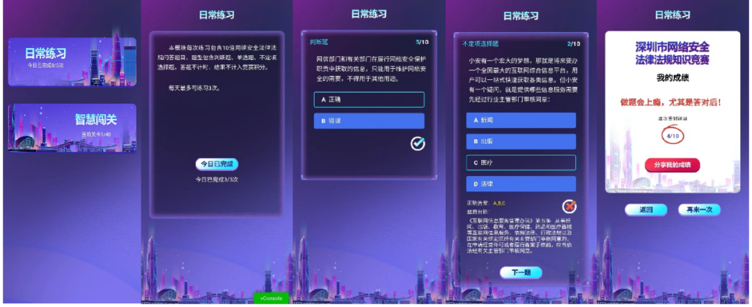 点击“练习&闯关”,将会看到“日常练习”和“智慧闯关”两部分。在“日常练习”中,小安在每一回合中都精心挑选了10道网络安全法律法规问答题目,题型包含判断题、单选题、不定项选择题,答题不计时,结果不计入竞赛积分。每天最多可练习3次,如果答错,小安将会给予详细的题目解析,帮助大家更好理解与记忆。勤能补拙,日常练习的题目越多,我们对抗网络安全问题的底气与实力就会越强。