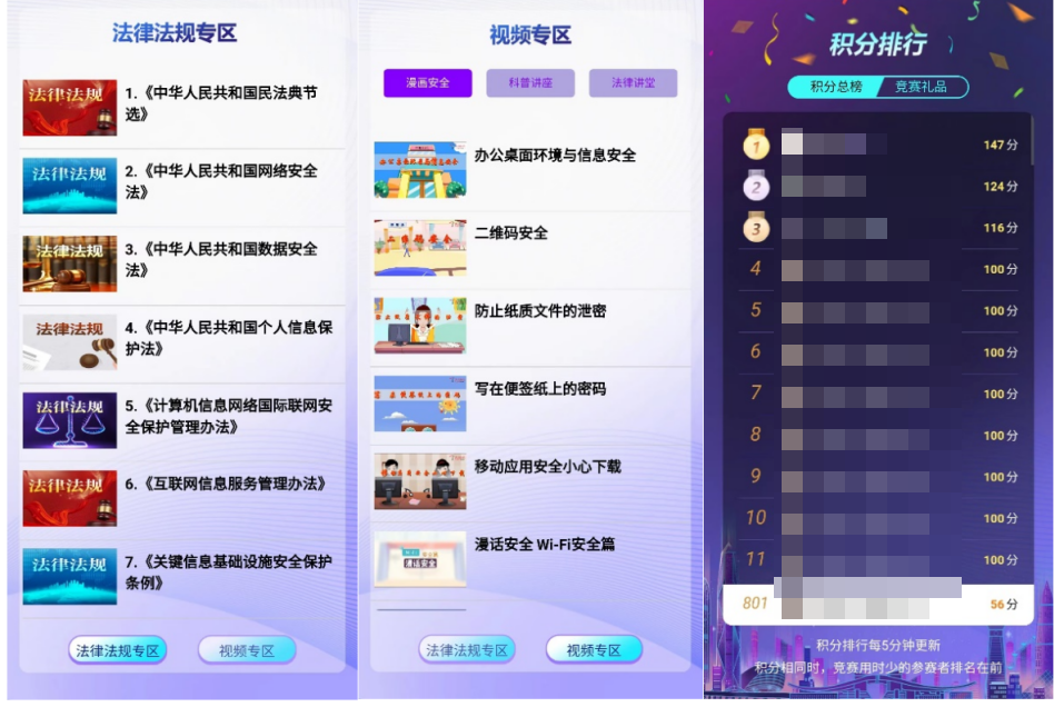小安还特意为参赛者们准备了“藏宝库”——学习园地。这里将是助你迅速进阶的“练功房”,设有科普视频专区和法律法规专区。科普视频专区收集了多门网络安全、数据安全相关课程,通过漫画、讲堂等喜闻乐见的形式让大家可以轻松成为“安全达人”;法律法规专区包含《民法典》(隐私权和个人信息保护部分)《网络安全法》《数据安全法》《个人信息保护法》《关键信息基础设施安全保护条例》《数据出境安全评估办法》等近年来网络安全、数据安全领域重要法律法规。大家可以随时随地学习,谁能掌握更多,谁就更有机会成为本次安全之旅的最大赢家。