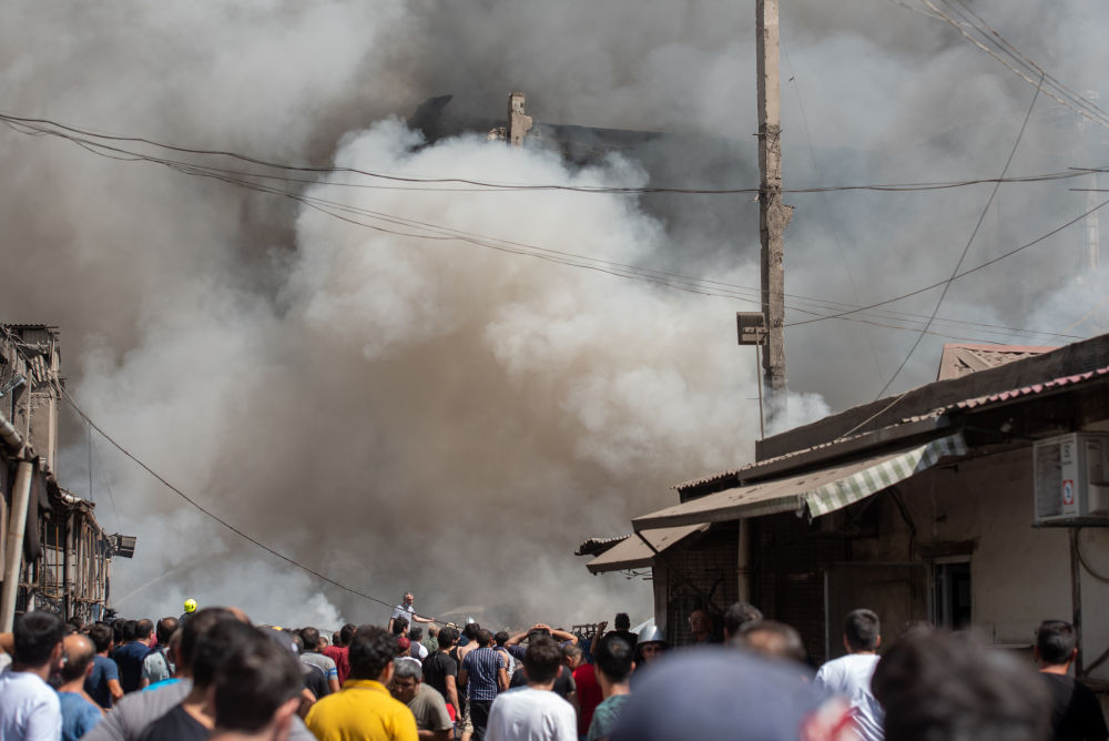 8月14日,人们聚集在亚美尼亚首都埃里温的购物中心爆炸现场附近。新华社发(阿萨塔·耶塞恩茨摄)