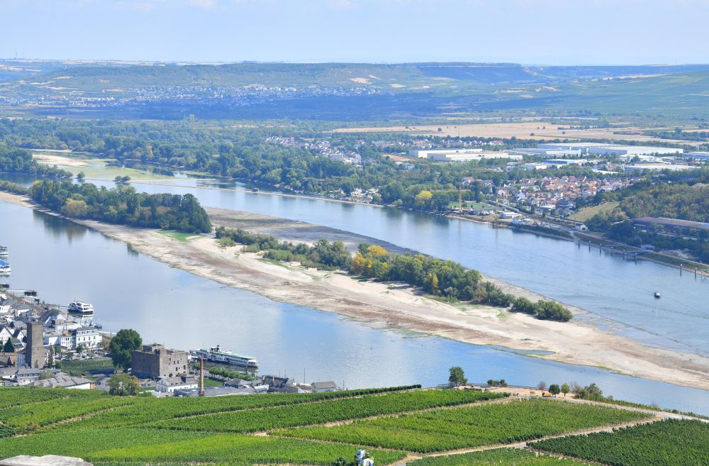 这是8月16日在德国黑森州吕德斯海姆拍摄的莱茵河。受近期持续高温干燥天气影响,莱茵河在德国境内多段出现不同程度水位下降。(新华社记者任鹏飞摄)