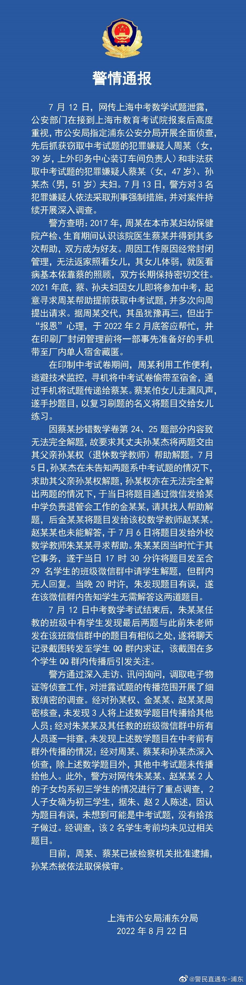 8月22日,上海市公安局浦东分局发布警情通报称,已对窃取中考试题的犯罪嫌疑人周某和非法获取中考试题的犯罪嫌疑人蔡某、孙某杰夫妇依法采取刑事强制措施。