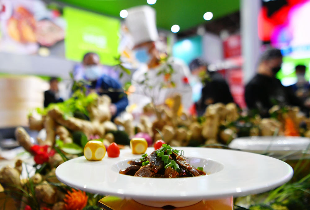 资料照片:2021年12月2日,在2021中国预制菜产业大会暨展会现场,参展商展示一盘快熟菜品。 新华社记者 魏培全 摄