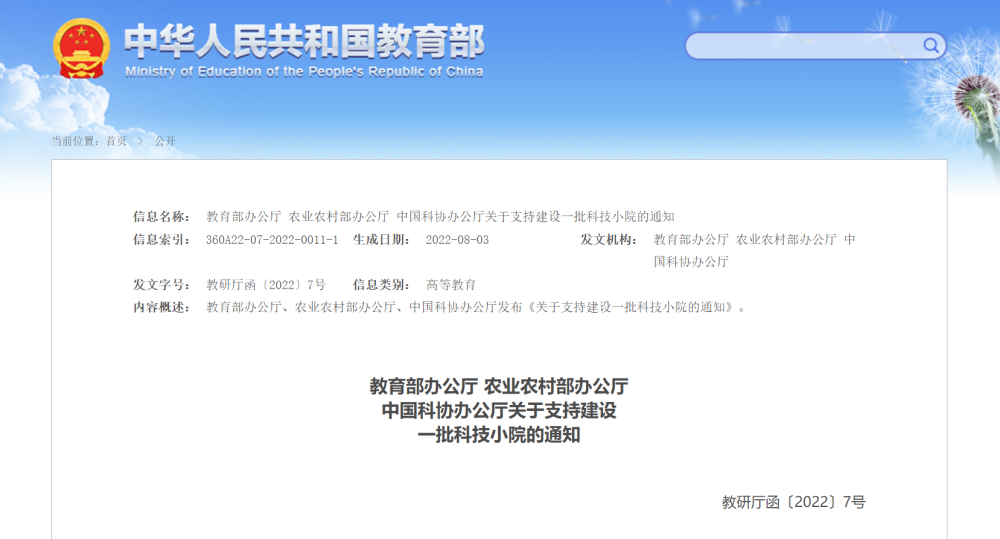 记者8月23日从教育部获悉,教育部办公厅、农业农村部办公厅、中国科协办公厅日前联合印发通知,确定对68个研究生培养单位的780个科技小院予以支持建设,实现31个省份和新疆生产建设兵团全覆盖。