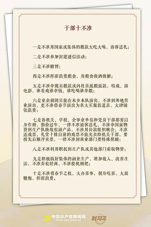 第二天,焦裕禄带着焦国庆去剧场认错,并补上了两毛钱的戏票款。这一趟,焦裕禄发现剧场一直把前三排的座位空着不卖票,说是留给县里领导的。这件事引起了他的关注,他主持召开县委扩大会议,以剧院的事为例,制定了《干部十不准》: