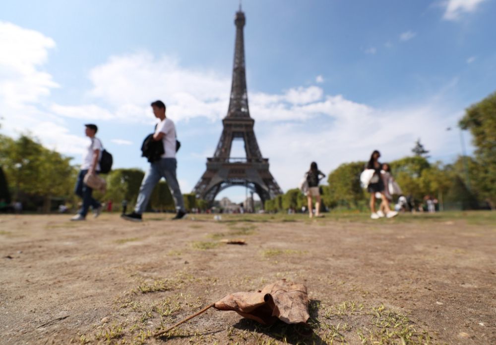这是8月17日在法国巴黎战神广场拍摄的干枯的草坪和干枯脱落的树叶。新华社记者高静摄