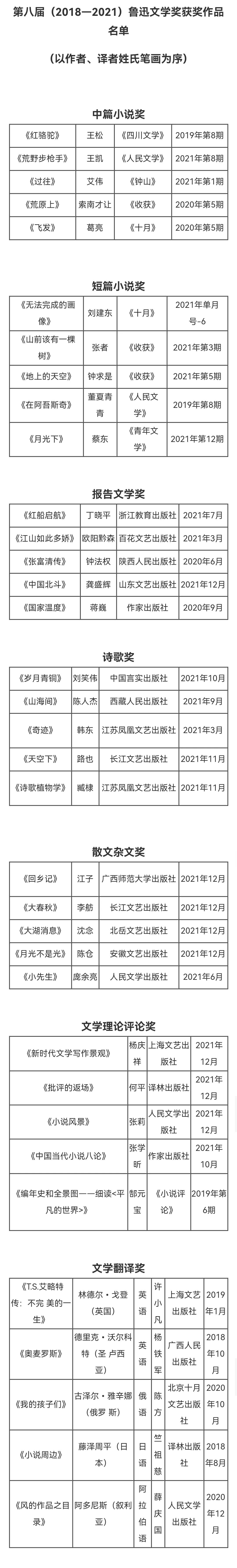 鲁迅文学奖每4年评选一次,第八届鲁迅文学奖评奖年限为2018年1月1日至2021年12月31日。鲁迅文学奖设置如下奖项:中篇小说奖、短篇小说奖、报告文学奖、诗歌奖、散文杂文奖、文学理论评论奖、文学翻译奖,各奖项获奖作品不超过5篇。其中,本届文学翻译奖评选范围限于外国文学作品的汉语译本。