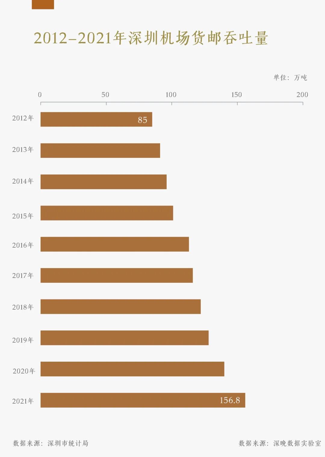 2021年,深圳宝安国际机场货邮吞吐量达到156.8万吨,排名中国内地机场第三,同比增长超12%,