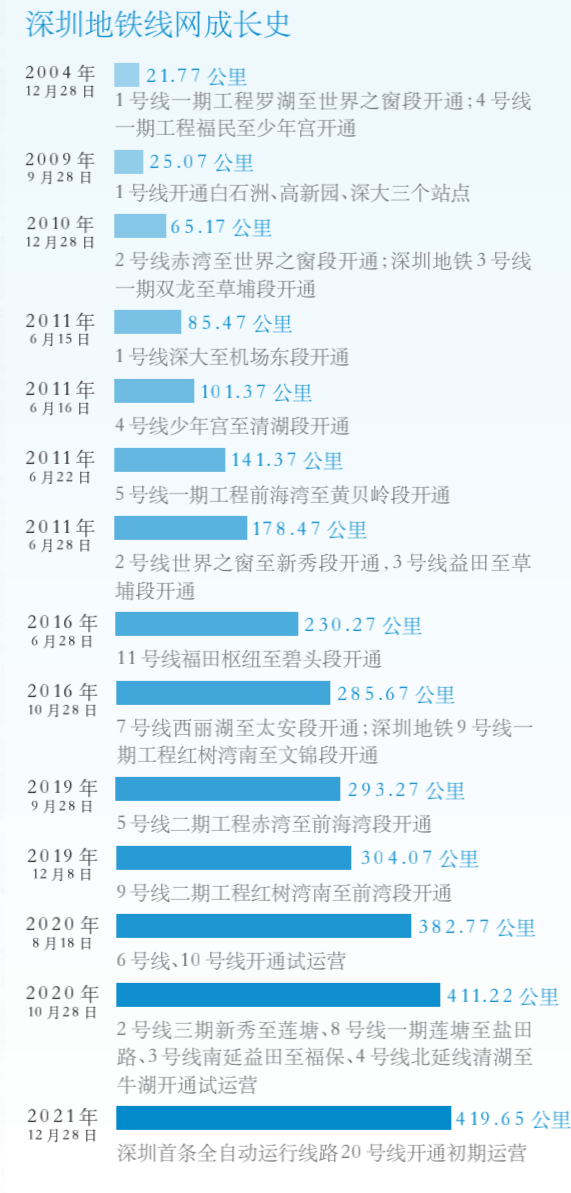 截至2021年底,深圳市轨道交通运营线路已增至13条,线网长度达到431公里,全市城市轨道交通线网密度达0.22公里/平方公里,连续多年位列全国第一。