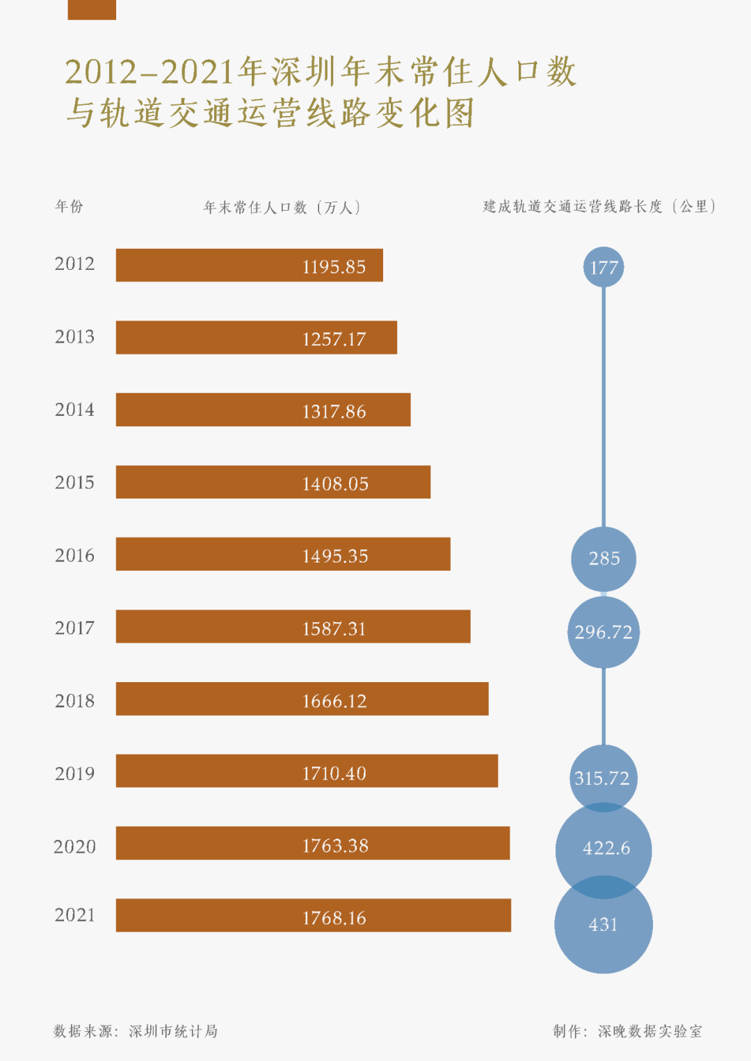 2009年至2021年,深圳的地铁车站总数由22个增至288个,翻了13倍。