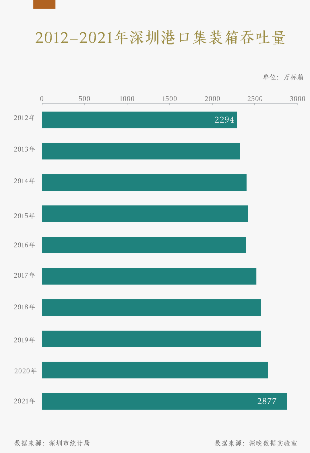 2021年深圳港全年累计完成集装箱吞吐量 2877 万标箱。创历史新高,集装箱吞吐量位居全球第四。