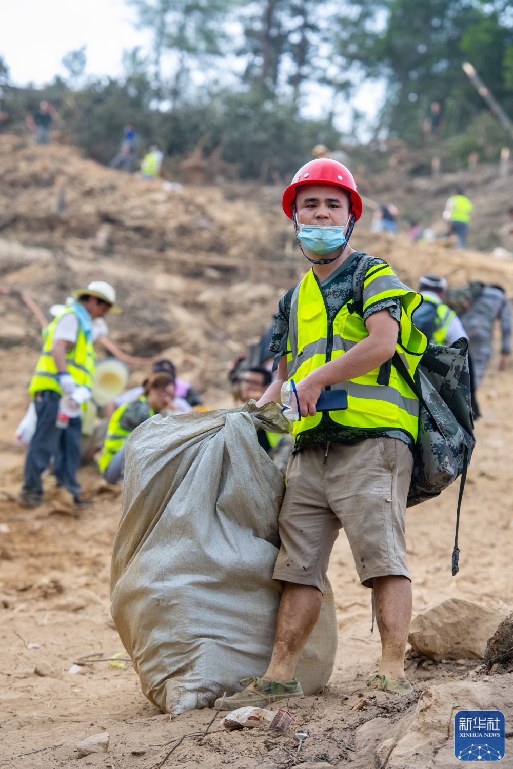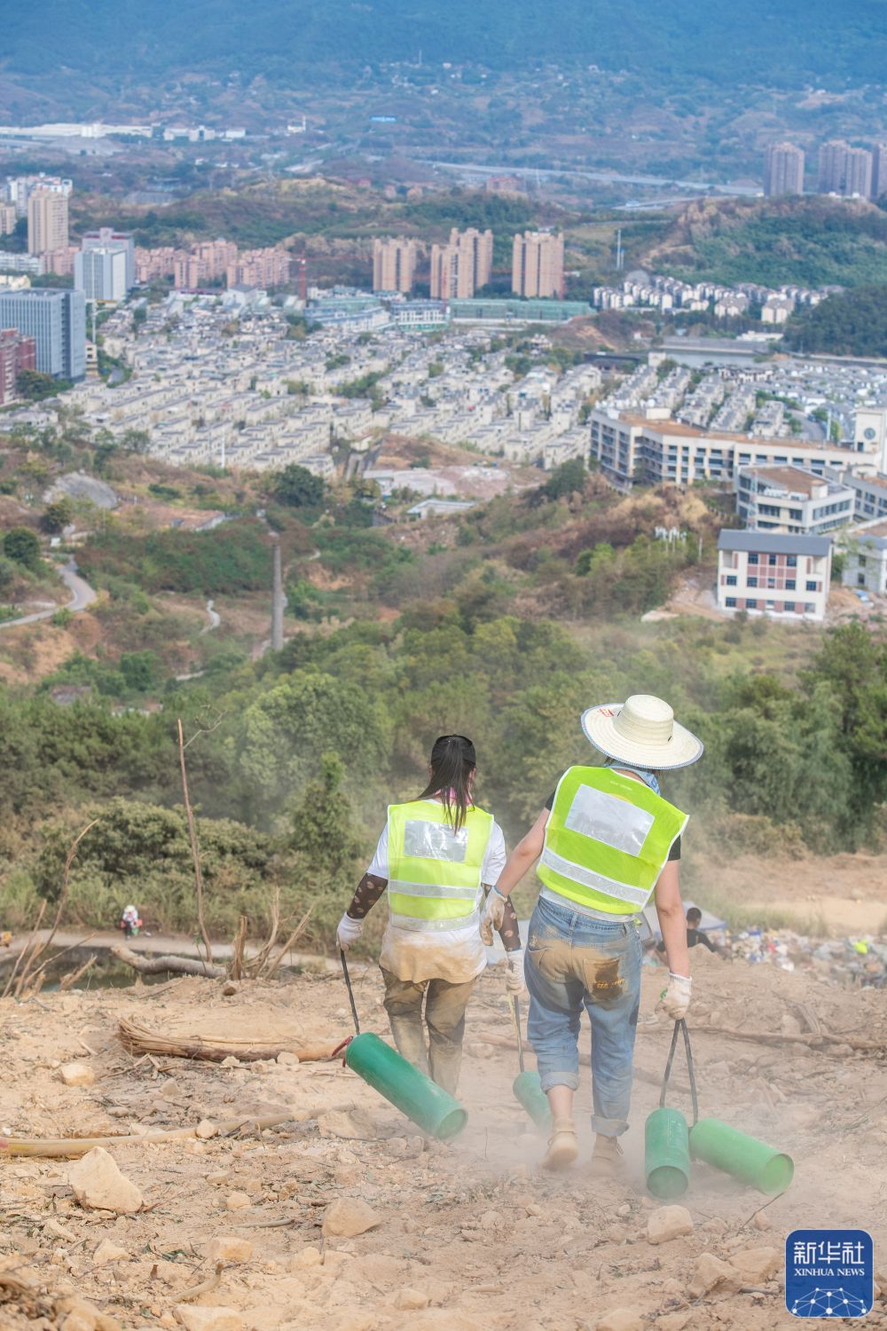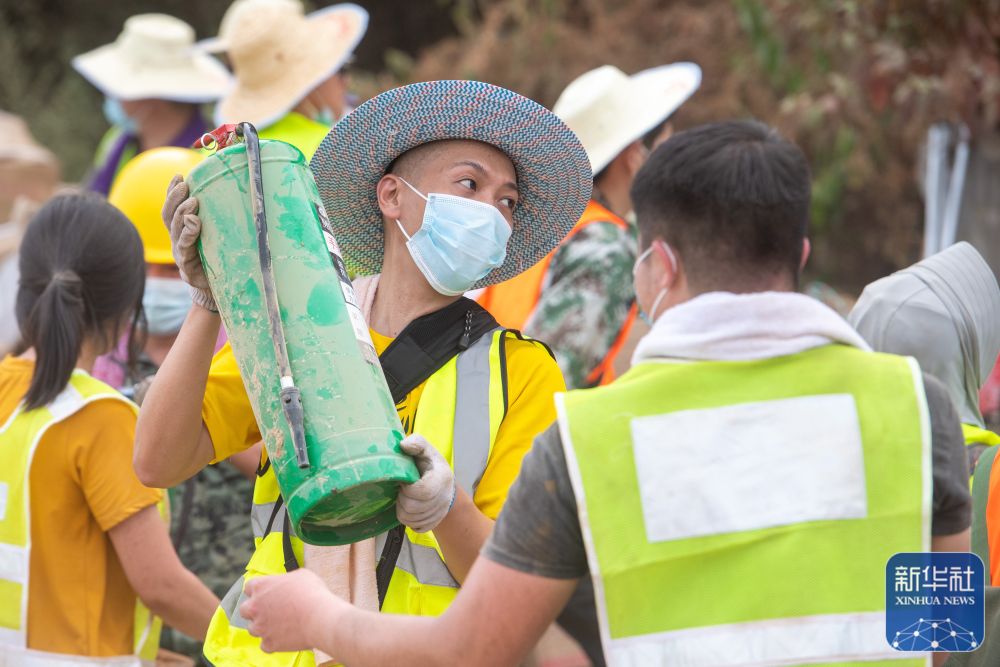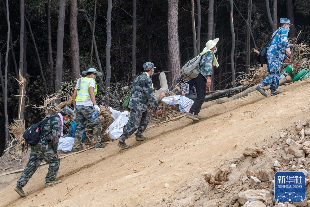 8月26日,在重庆北碚区歇马街道,志愿者往山下运送使用过的灭火器。