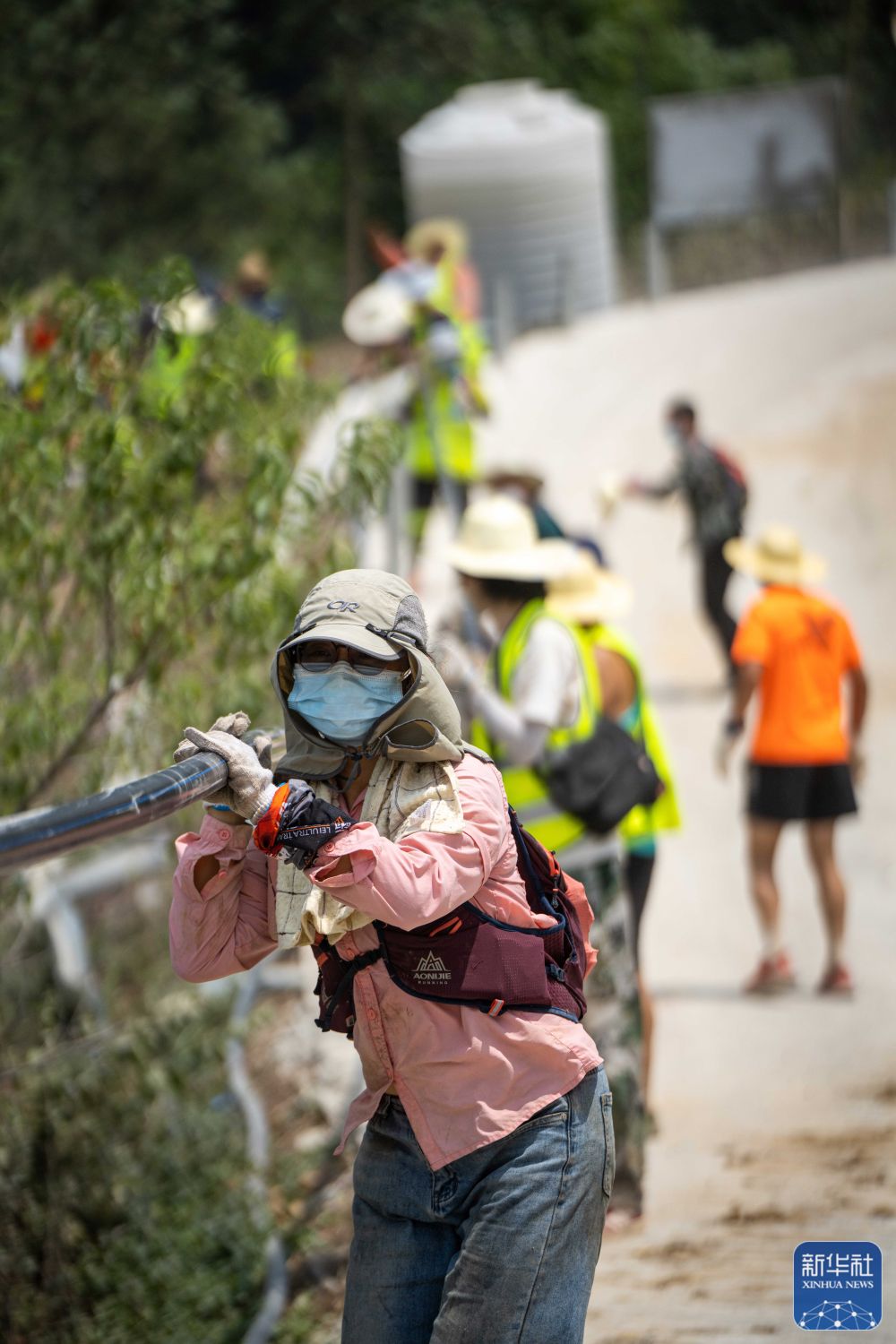 8月26日,为防止附近山火复燃,志愿者在铺设输水管道。